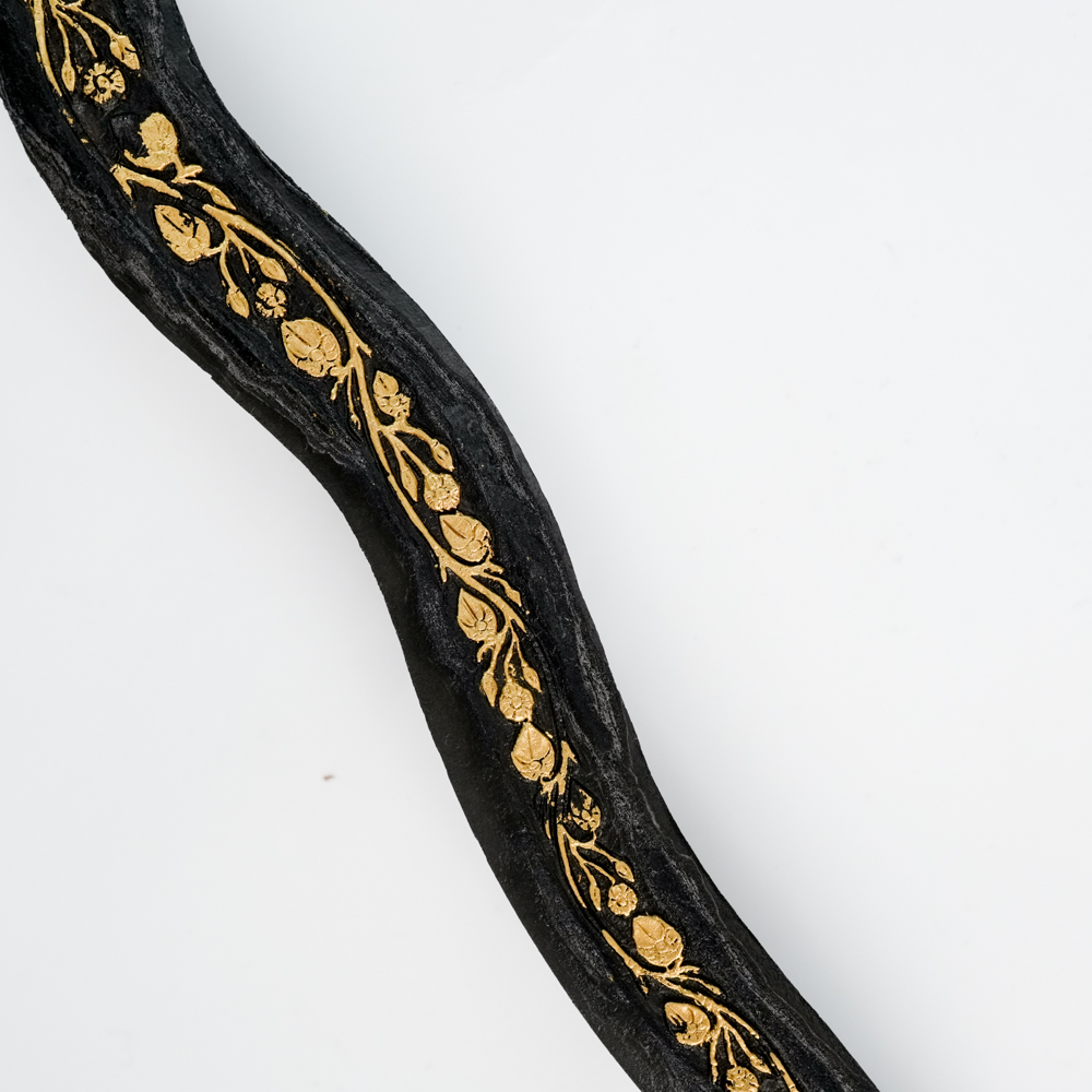 Ricikan pada dhapur ini juga khas. Ia memiliki kembang kacang nyucuk peksi — seolah paruh burung yang menusuk lembut di ujung gandik. Kata “nyucuk” sendiri bermakna “menyerupai,” sehingga nyucuk peksi berarti “seolah paruh burung.” Selain itu, Megantoro juga memakai jalen, lambe gajah satu, greneng, serta kruwingan tunggal yang memanjang hampir tiga perempat panjang bilah. Gonjo-nya berbentuk wilut, dengan ujung kanyut seperti buntut cecak yang melengkung ke atas — detail yang khas dan penuh karakter.
