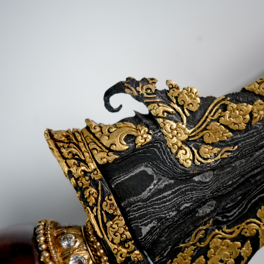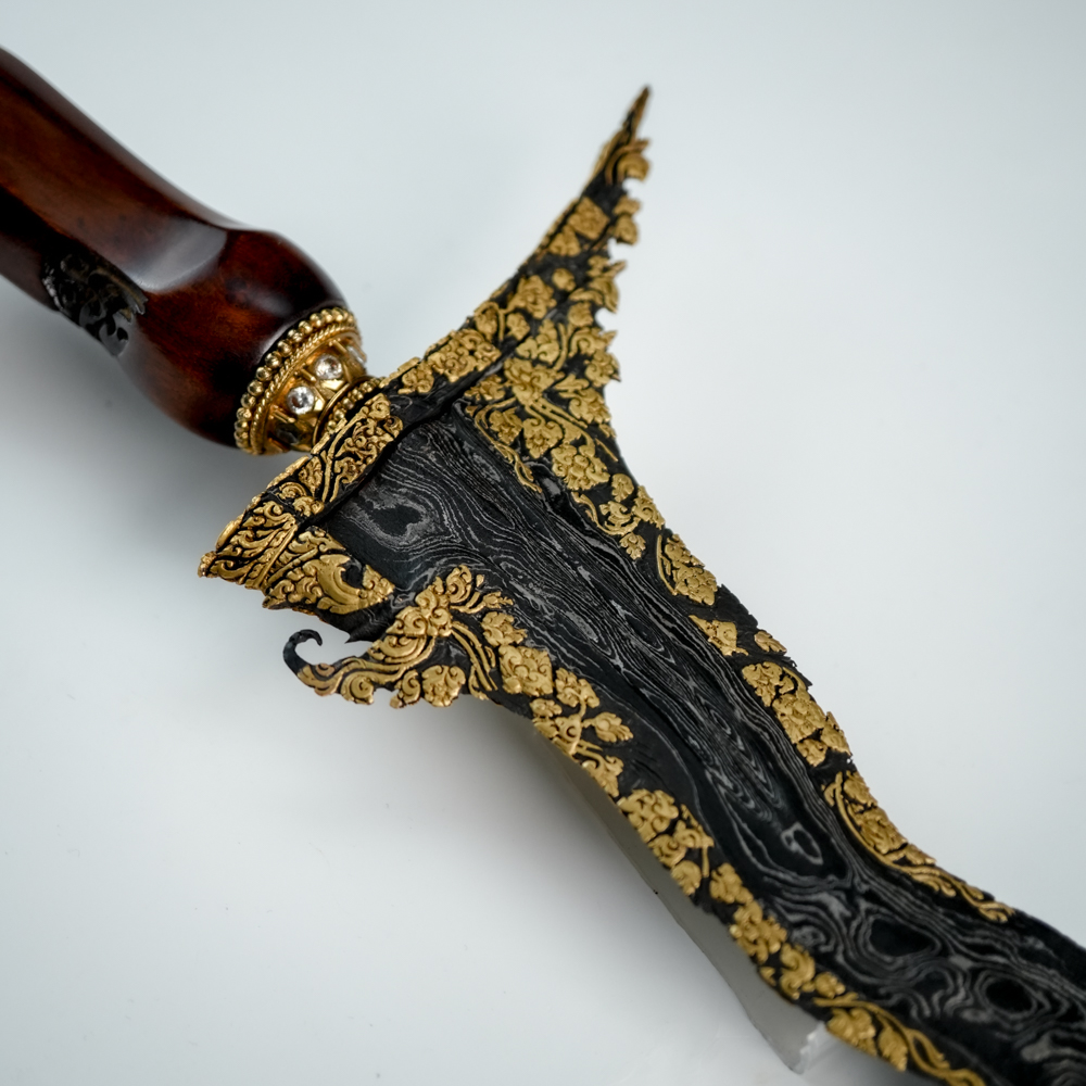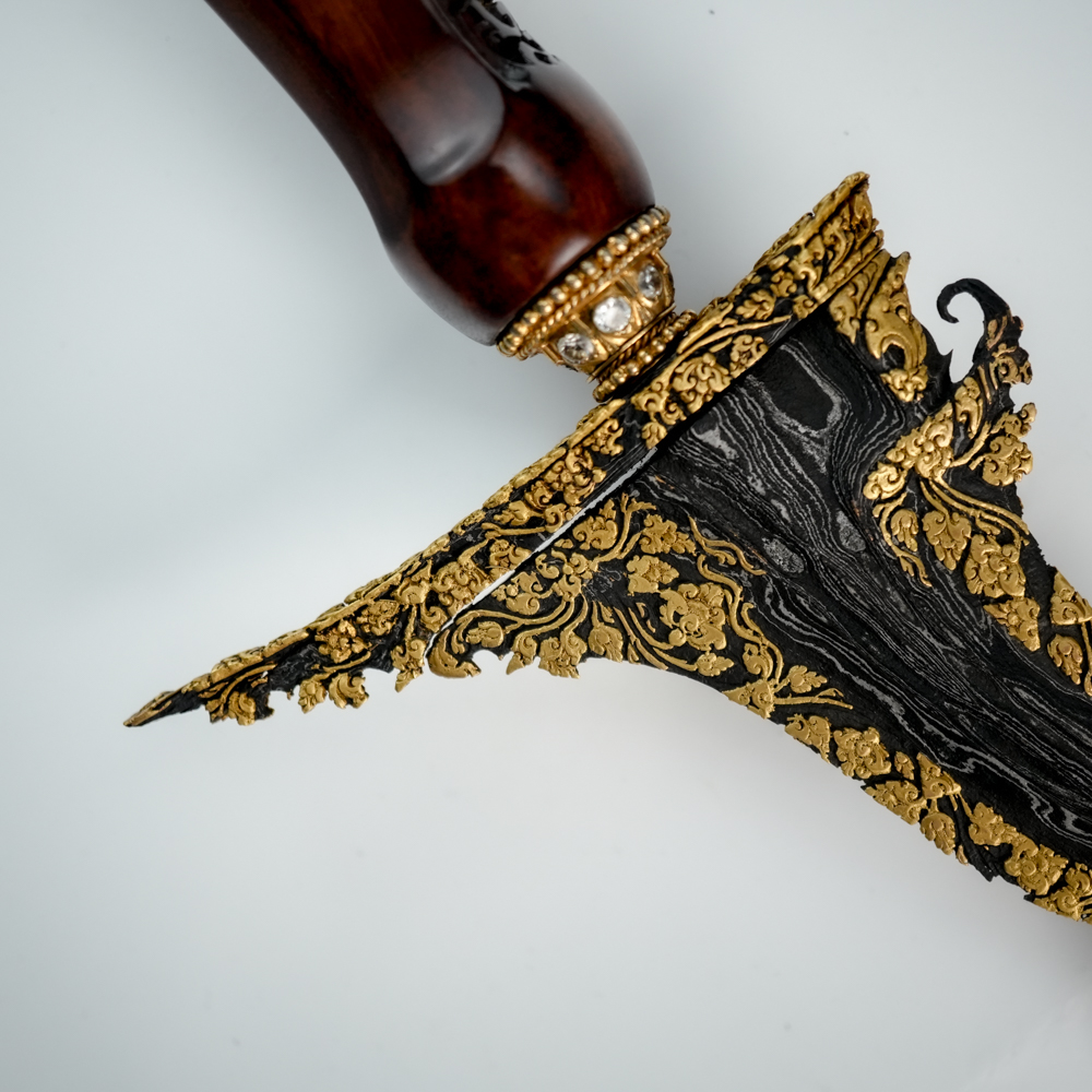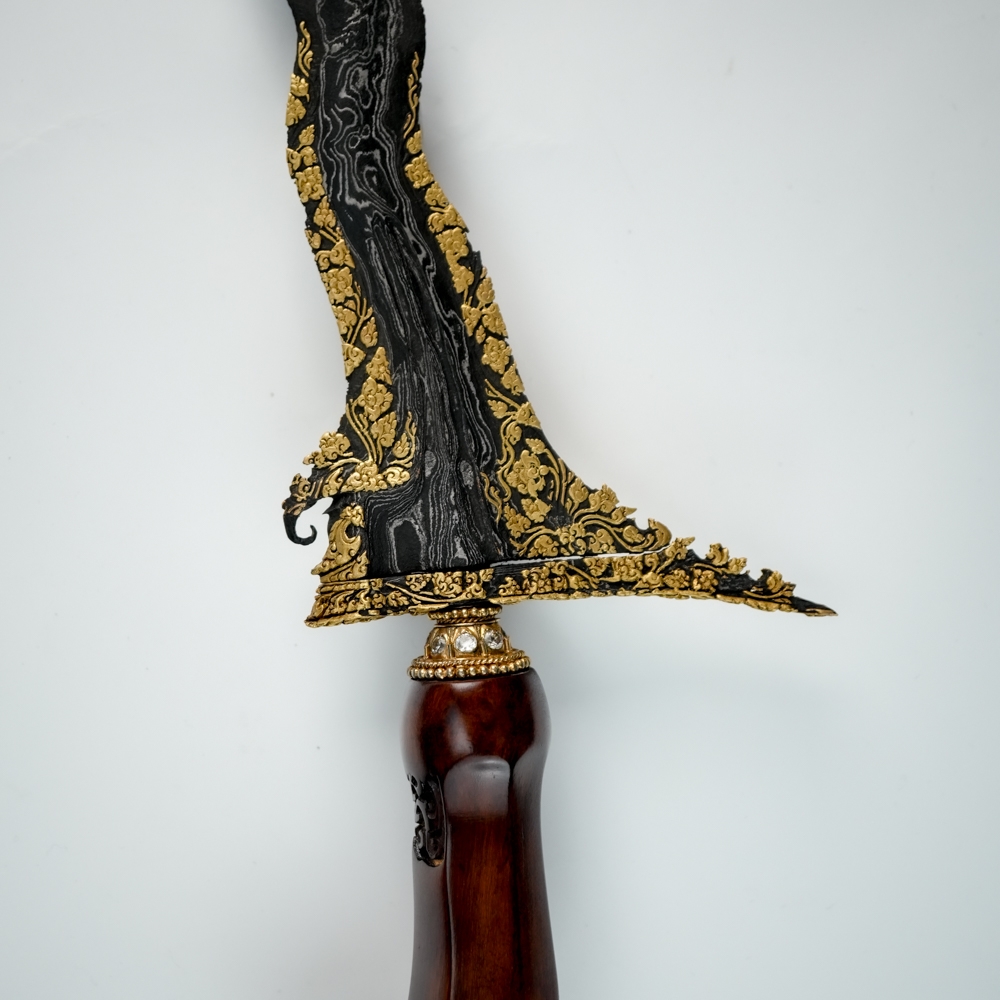 Pusaka ini tampil berkelas dengan hiasan tinatah emas bergaya Wadana Sanga—sembilan bidang bilah yang dihiasi emas dengan keutuhan mencapai 90%.